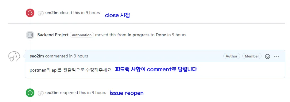 반려된 issue는 reopen되고 수정 작업 후 다시 close하여 PR 결제를 받습니다