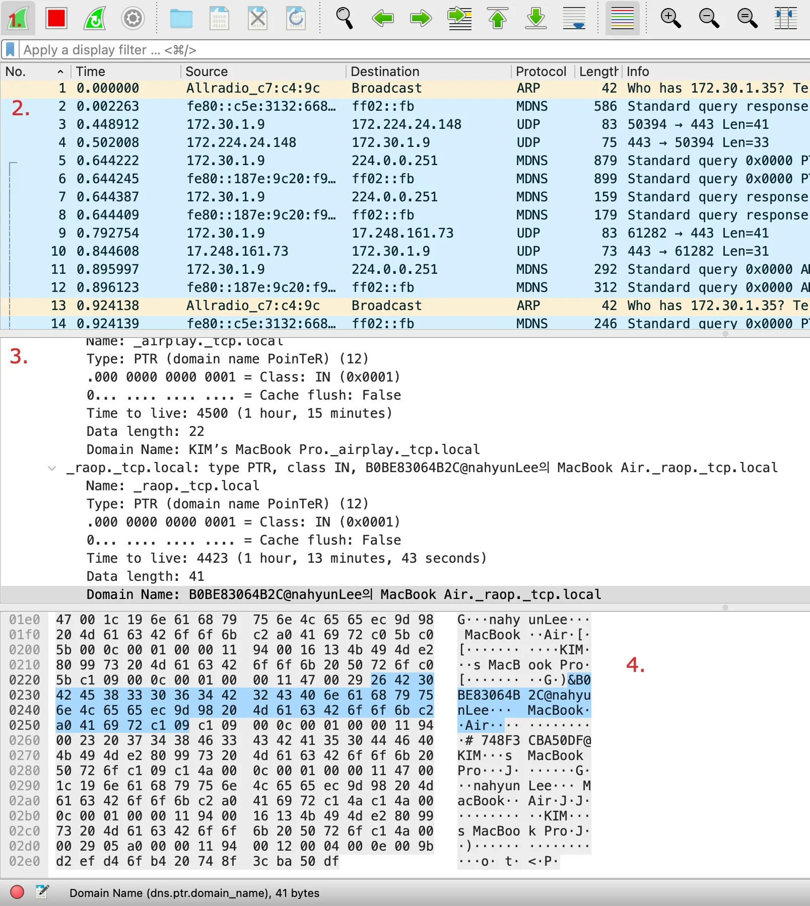 패킷 디테일 - 패킷 리스트에서 선택한 패킷의 세부정보를 표시합니다. 패킷 내부정보를 해석해 줄 뿐만 아니라 몇몇 정보들은 원래 패킷에는 없지만 패킷 분석을 위해 Wireshark가 자체적으로 추가한 필드도 표시한다.