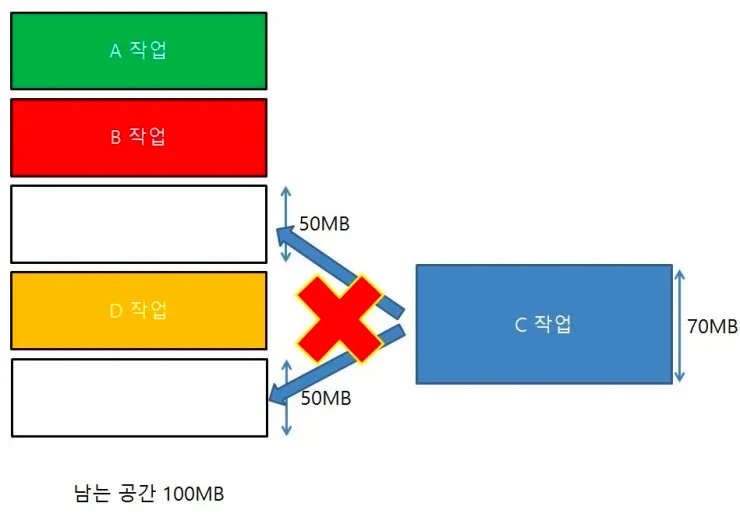 다음과 같은 그림이 있다고 해봅시다. 메모리의 남는 공간이 100MB인데, 이 공간은 연속적이지 않습니다. 그렇기 때문에 충분히 c작업이 들어갈 수 있어도 프로세스를 쪼개서 넣을 수 없기 때문에 해당 프로세스는 메모리에 적재할 수 없습니다. 이러한 경우를 external fragmentation 외부 단편화라고 합니다.