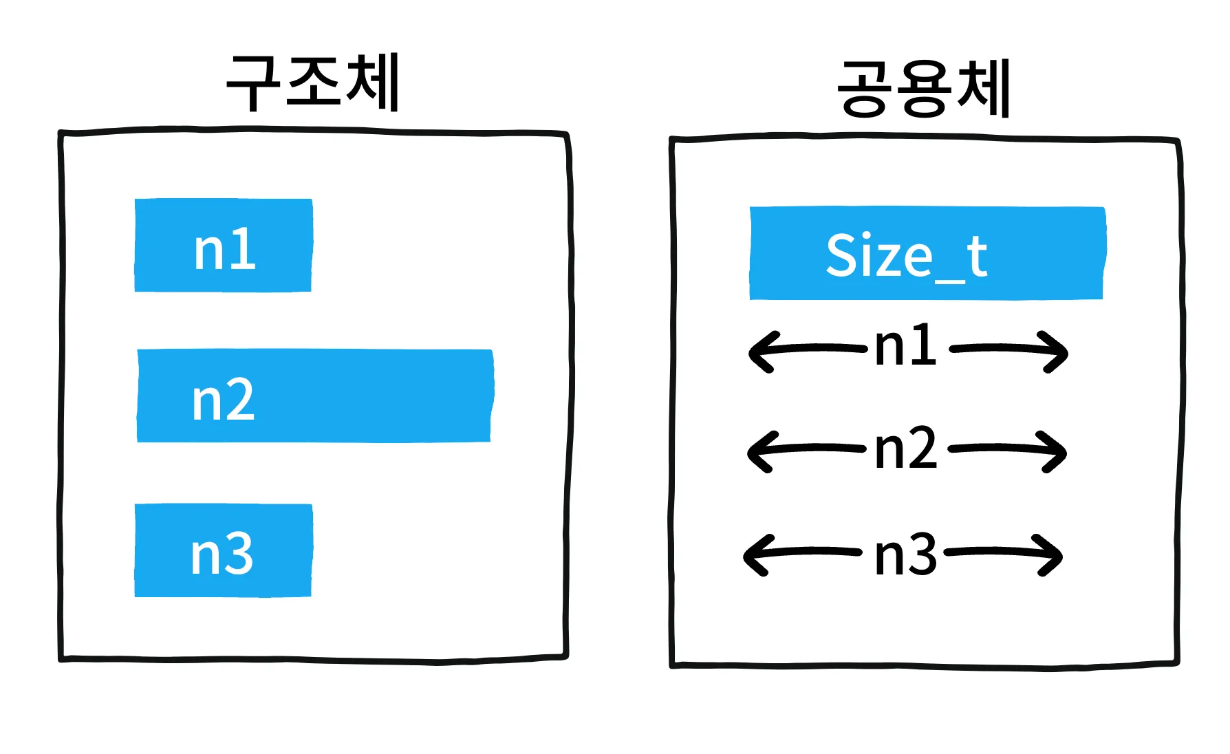 반면 공용체를 선언한다면, 공용체는 공용체의 멤버들 중 가장 큰 메모리 사이즈를 가지고 있는 멤버의 사이즈만큼만 할당되어, 이를 공유하게 된다.