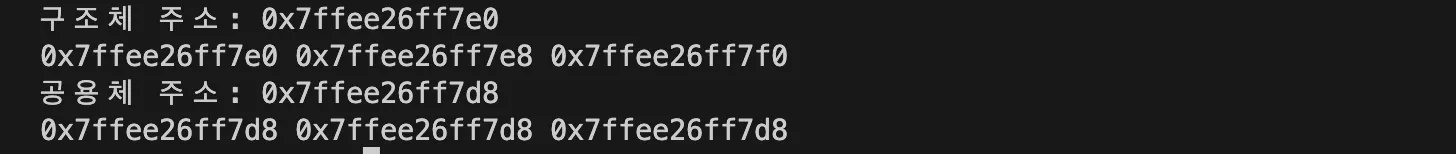 공용체를 구성하는 멤버들의 주소 값이 동일하다는 것을 알 수 있다. 바로 우리는 여기서 공용체의 메모리 할당 특성을 알 수 있다!