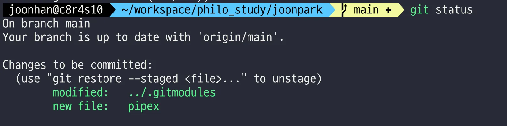 그리고 추가한 서브모듈은 staging 영역까지 자동으로 올라간다. 즉, 추가한 서브모듈에 대해 git add 를 자동으로 수행한다는 것이다.