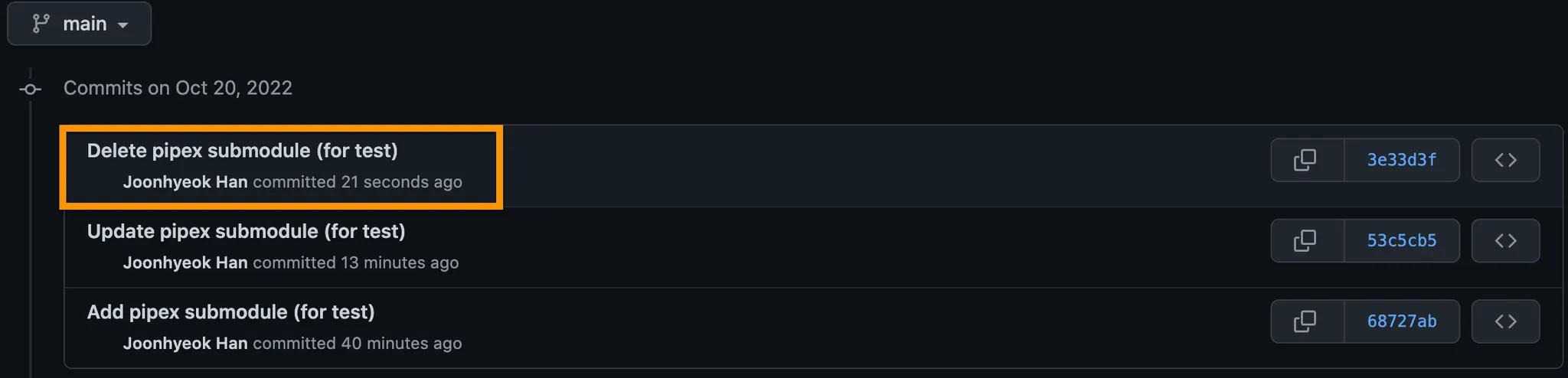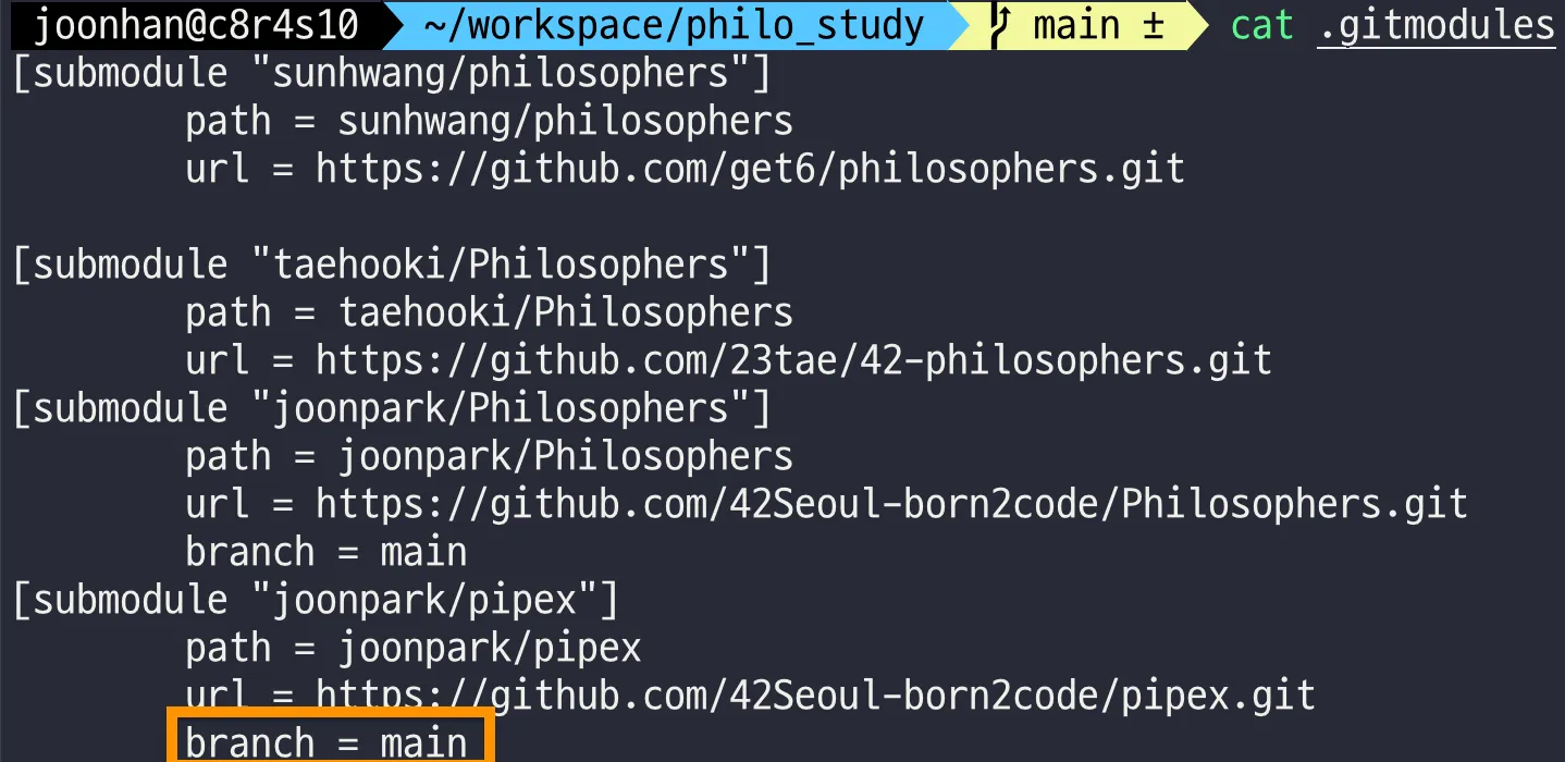 위의 사진처럼 .gitmodules 파일을 확인하면 해당 서브모듈 정보에 branch = main 이 추가된 것을 확인할 수 있다.