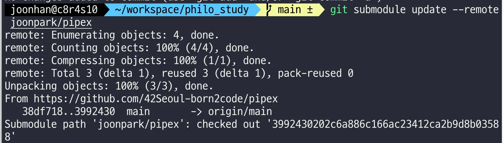그렇기 때문에 서브모듈에 새로운 commit 이 생겼다면 서브모듈을 가지고 있는 repository 에서 번거롭지만 직접 서브모듈을 업데이트 해주어야 한다.
