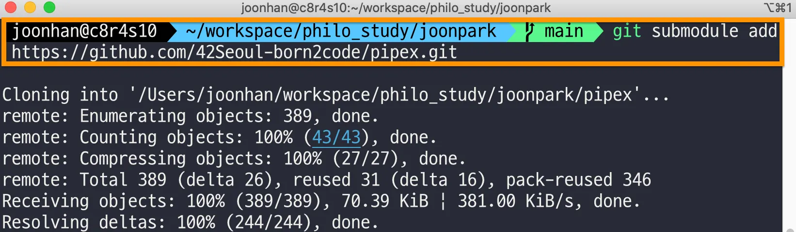 서브모듈을 추가하고자 하는 repository 에 아래와 같이 명령어를 실행한다.