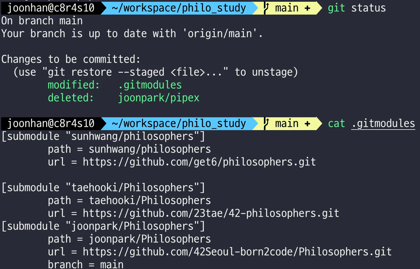 위의 명령어 하나만으로 .gitmodules 파일에 등록된 서브모듈 정보와 서브모듈 폴더가 삭제된 것을 확인할 수 있다.
