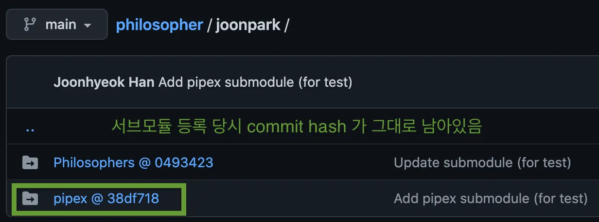 하지만, 서브모듈을 가진 repository 에 들어가면 서브모듈의 commit hash 가 여전히 38df718 을 가리키고 있다.