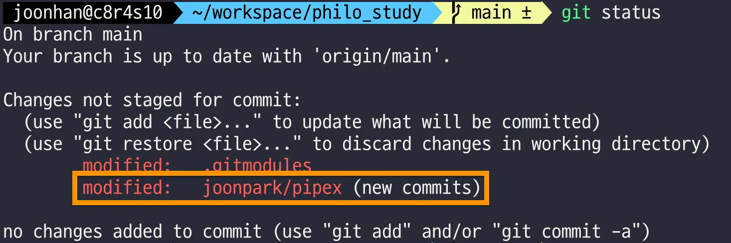 git status 명령어를 사용하면 서브모듈에 새로운 commit 이 생성되었다는 것을 확인할 수 있다.