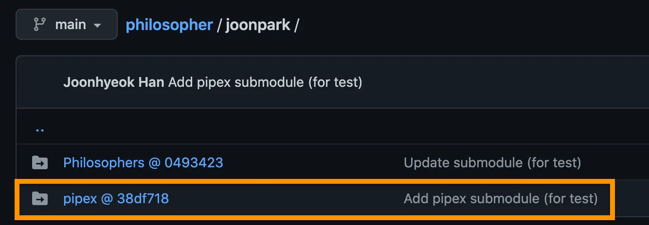 서브모듈 git repository 이름과 서브모듈의 commit hash 값이 함께 표시되며, 클릭 시 해당 repository 로 이동한다.