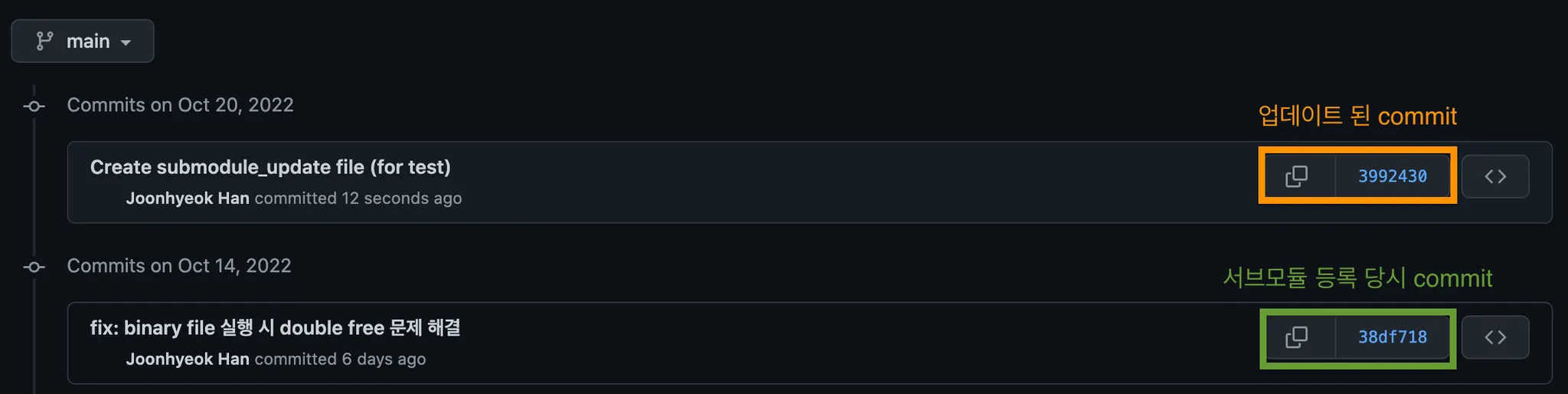 위의 사진은 서브모듈에 새로운 commit 이 등록되었고, commit hash 값은 3992430 이다.