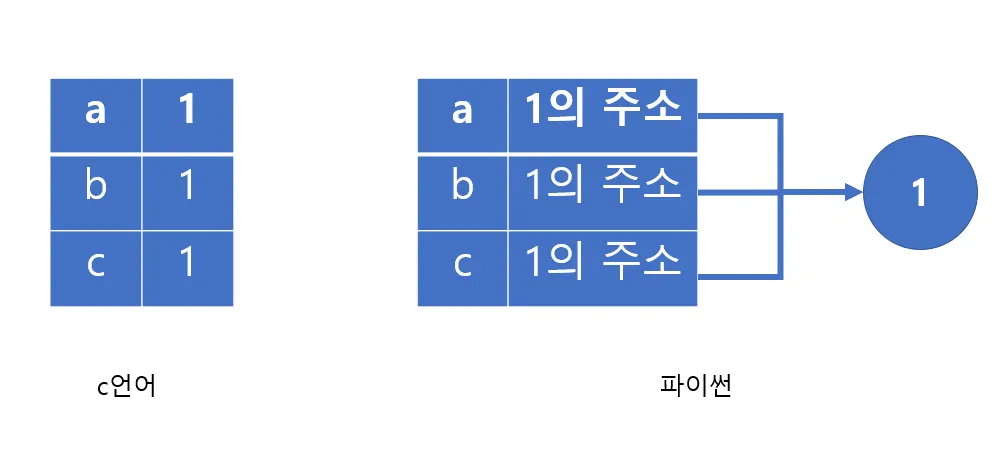 하지만 파이썬은 1이라는 객체를 생성하고 각 변수들은 1이라는 객체를 가리킨다.