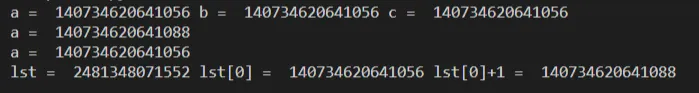 print('lst = ', id(lst),'lst[0] = ', id(lst[0]),'lst[0]+1 = ', id(lst[0]+1))