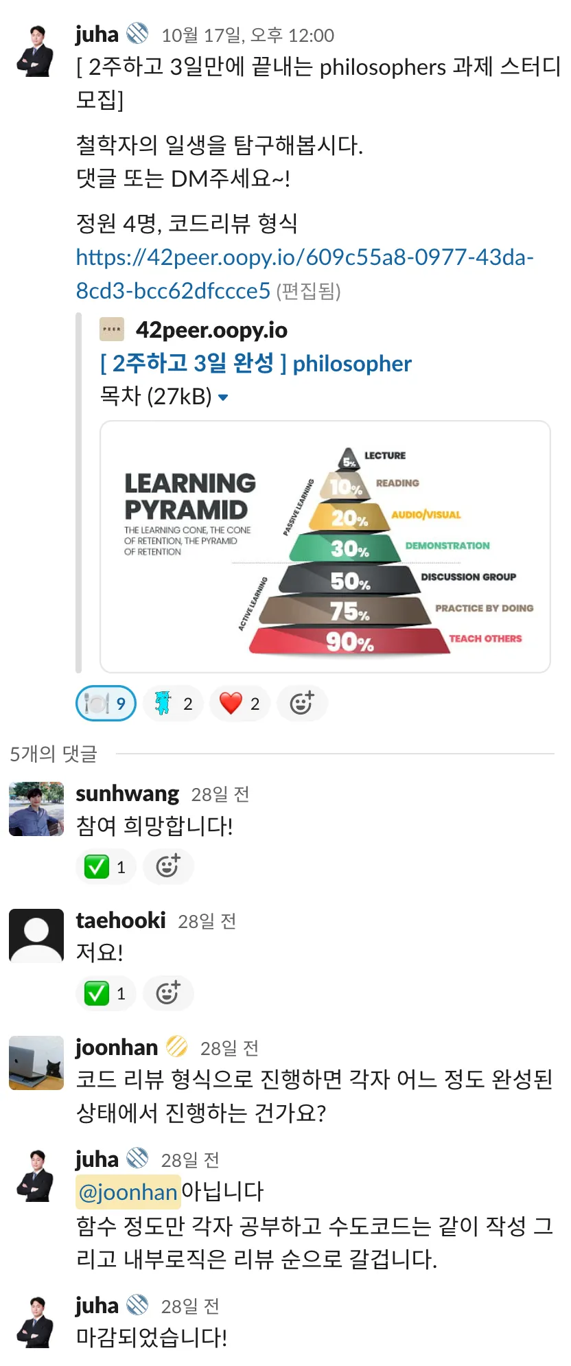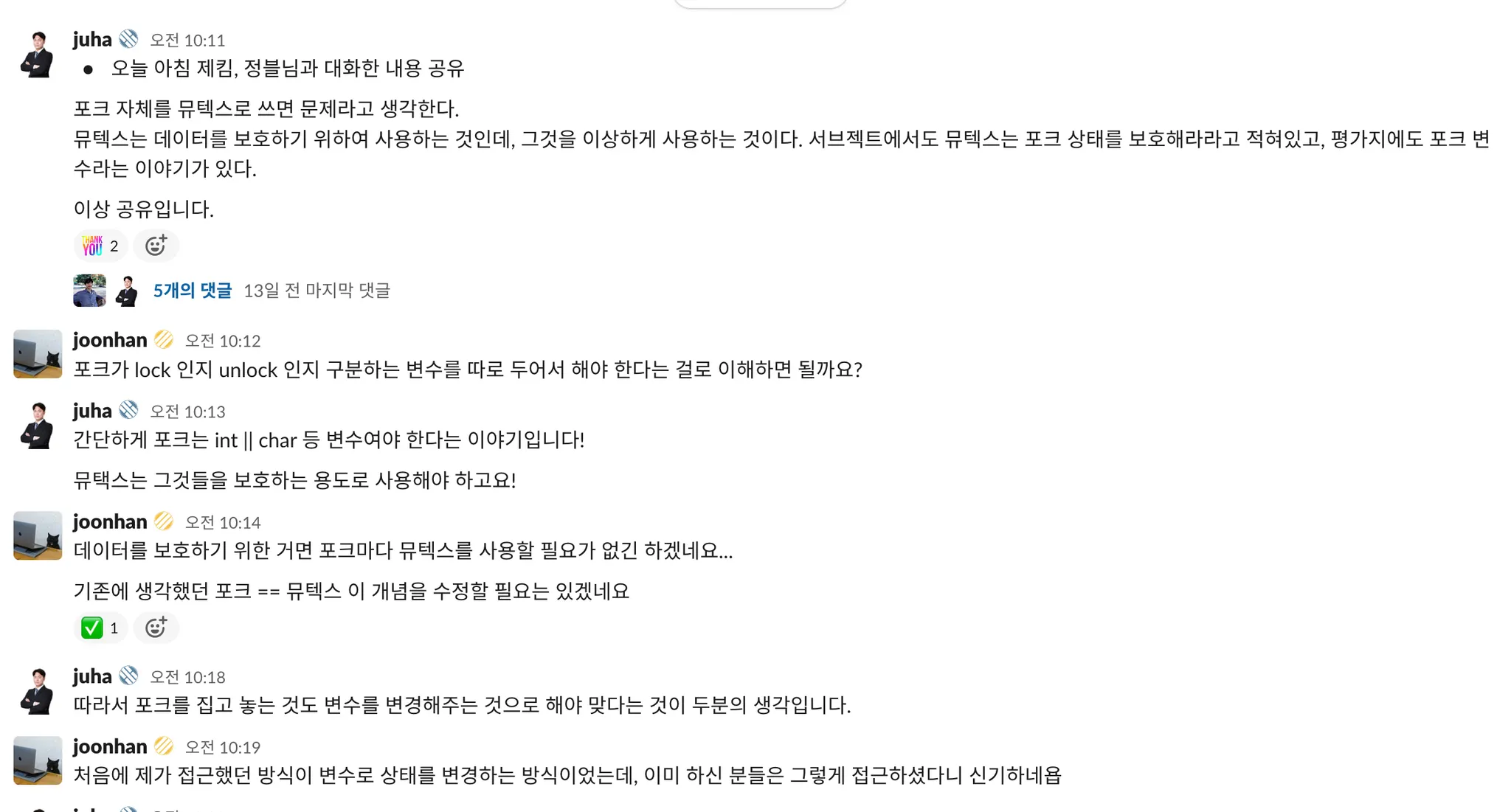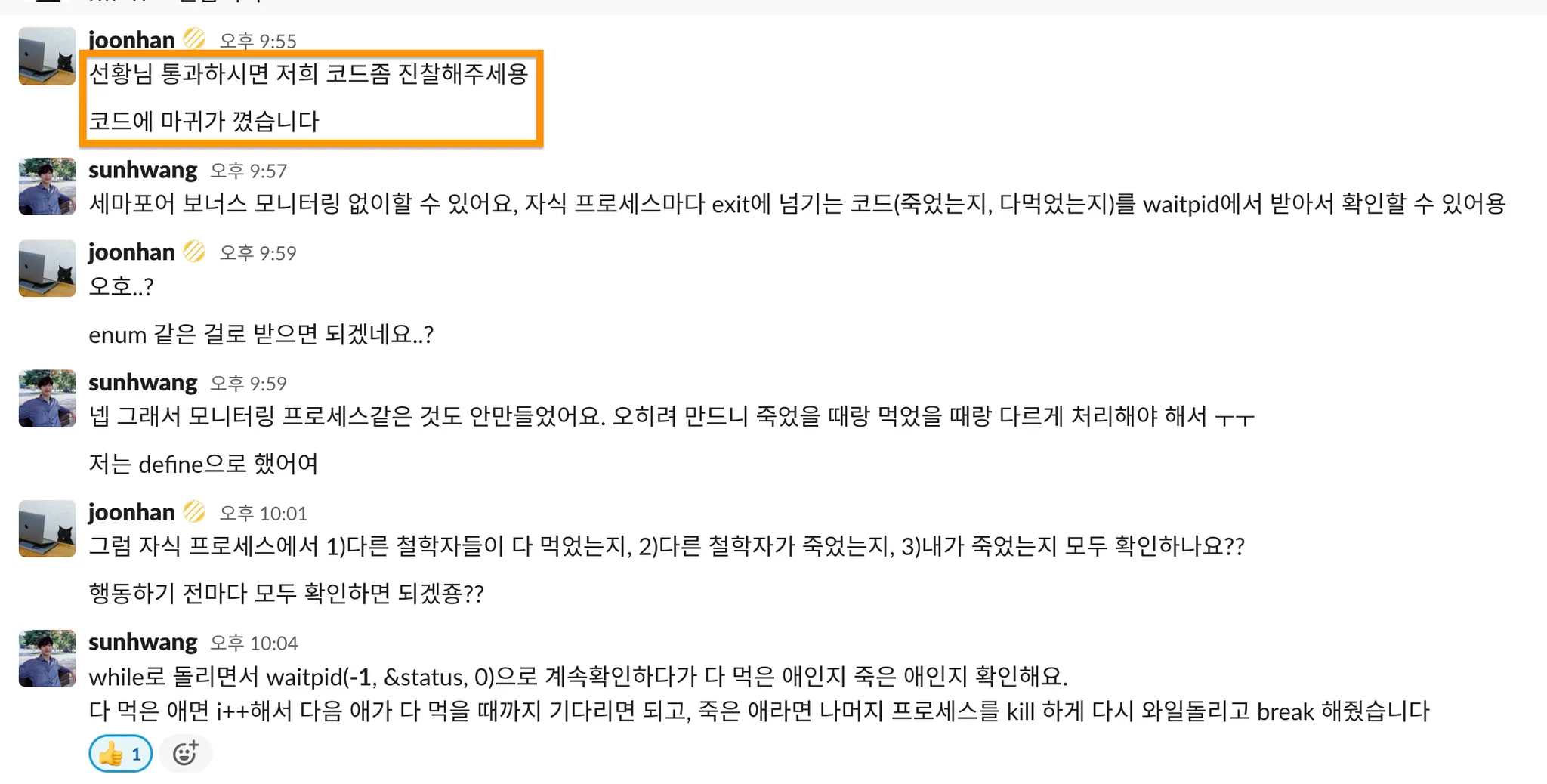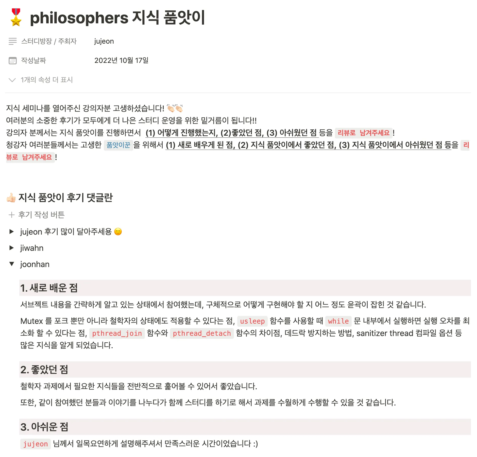 스터디 초반에는 처음 보는 개념과 함수들을 공부해야 하기 때문에 코드 리뷰를 받을 수 있는 부분이 없었다. 대신 과제를 어떤 방식으로 접근할 것인지, 과제에서 요구하는 것이 무엇인지 파악하기 위해 많은 이야기를 나누었다. 그리고 이전에 철학자 과제를 평가해본 적이 없어서 이미 과제를 해결하신 분들에게 어떻게 과제를 해결하면 좋을지 지식 품앗이를 요청하거나, 개인적으로 여쭤보기도 했다.