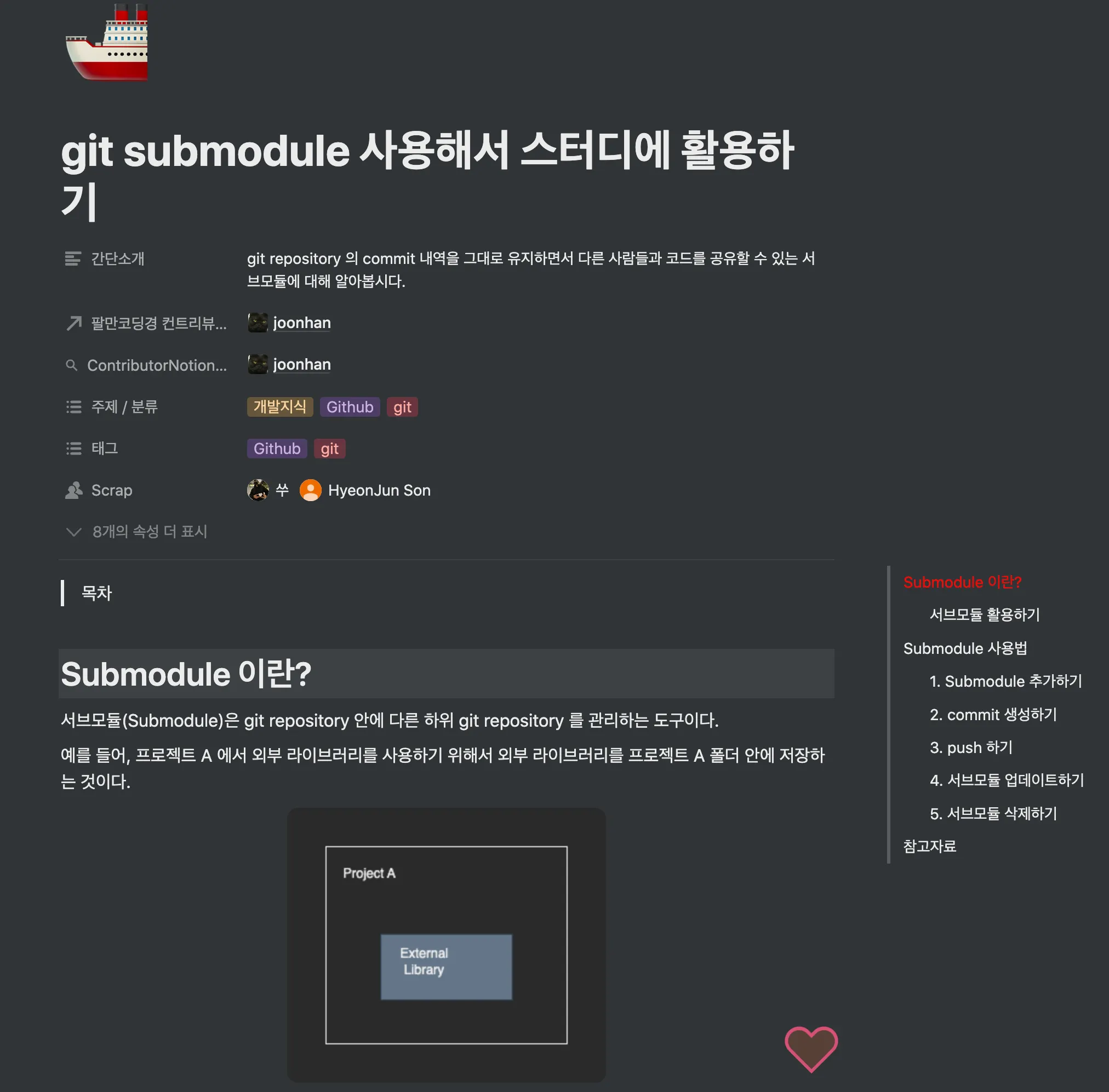 github 에 함께 공유할 repository 를 생성했고, submodule 로 각자의 repository 를 공유하도록 했다. git submodule 을 이번에 처음 써보았는데, 여러 명이 각자의 작업 내역을 공유하기 좋은 기능이라는 것을 알게 되어 이를 글로 작성하여 스터디원들 뿐만 아니라 다른 분들도 참고할 수 있게 글로 정리하였다. 이 과정에서 git 에 조금 더 익숙해질 수 있었다.