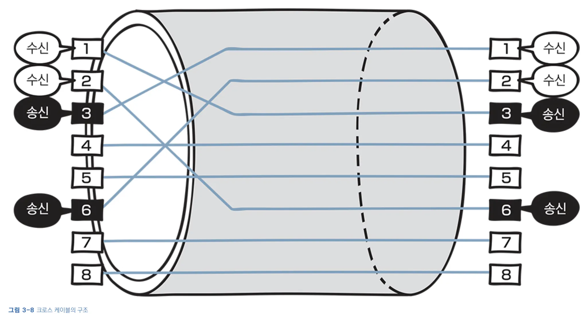 구리 선 여덟 개 중 한쪽 커넥터의 1번과 2번에 연결되는 구리선을 다른 쪽 커넥터의 3번과 6번에 연결한 케이블이다.