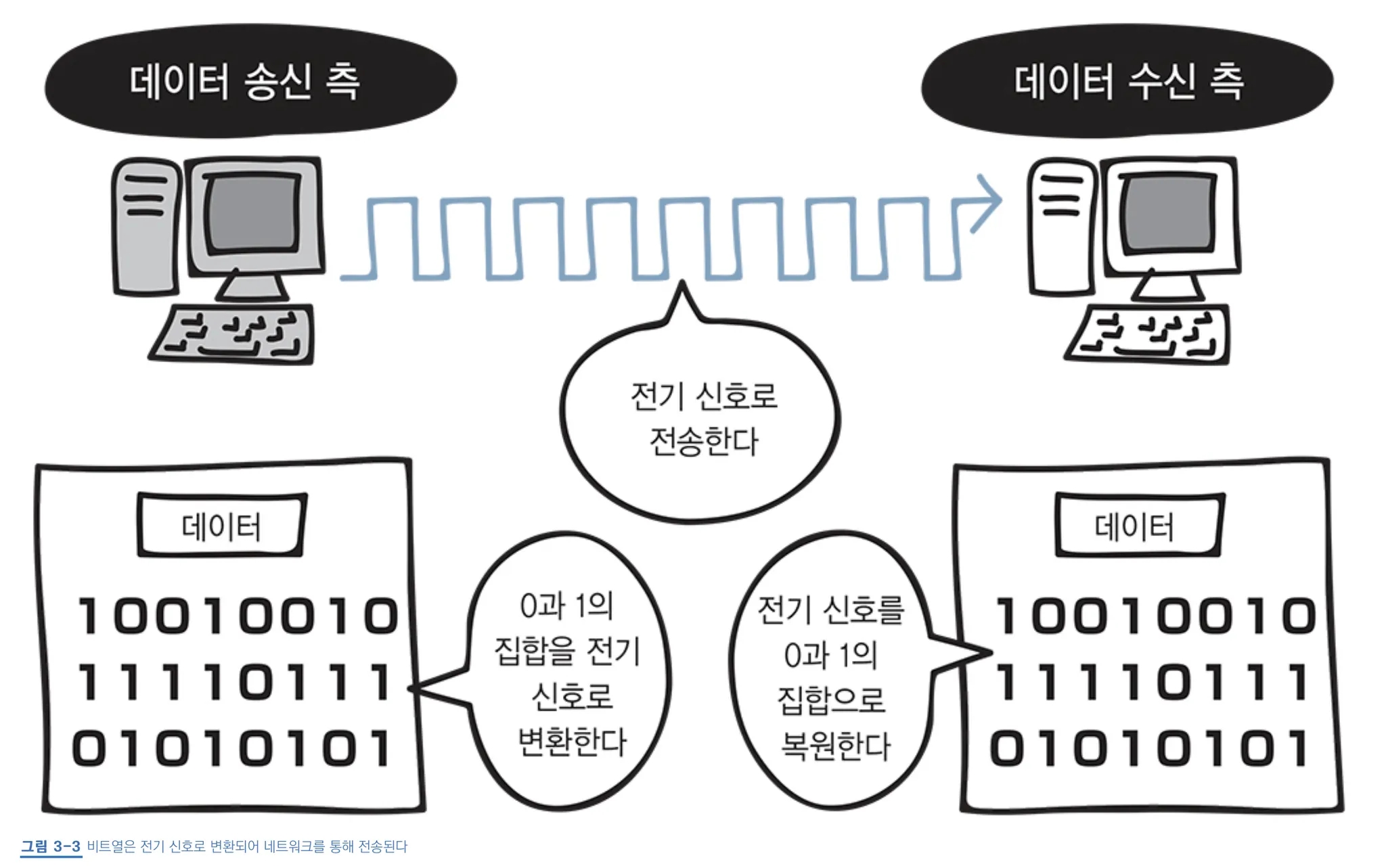 다음 그림과 같이 데이터 송신 측 컴퓨터가 전송하는 0과 1의 비트열 데이터는 전기 신호로 변환되어 네트워크를 통해 수신 측 컴퓨터에 도착한다. 수신 측 컴퓨터에서는 전기 신호를 0과 1의 비트열 데이터로 복원한다.