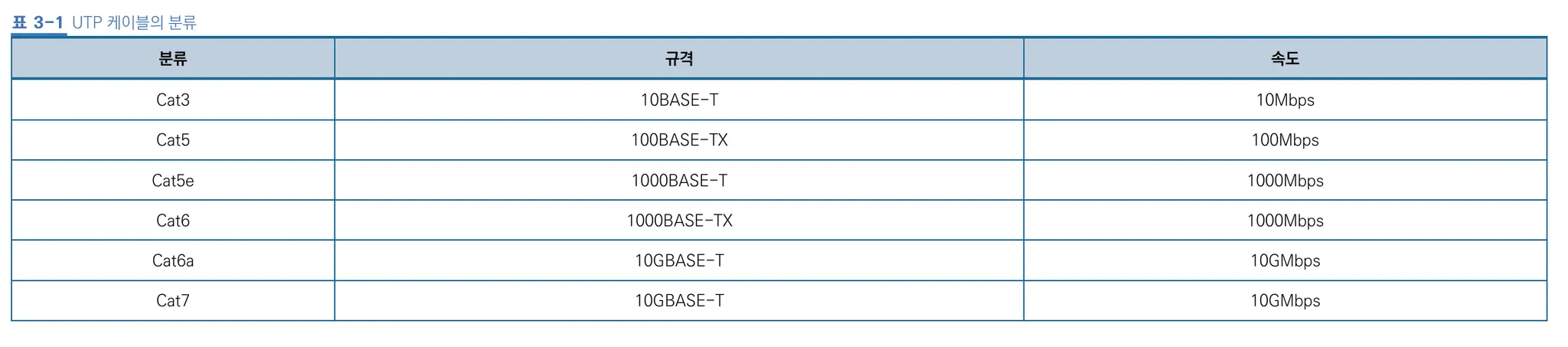 UTP 케이블은 데이터 전송 품질에 따라 다음 표와 같이 분류 할 수 있다.
