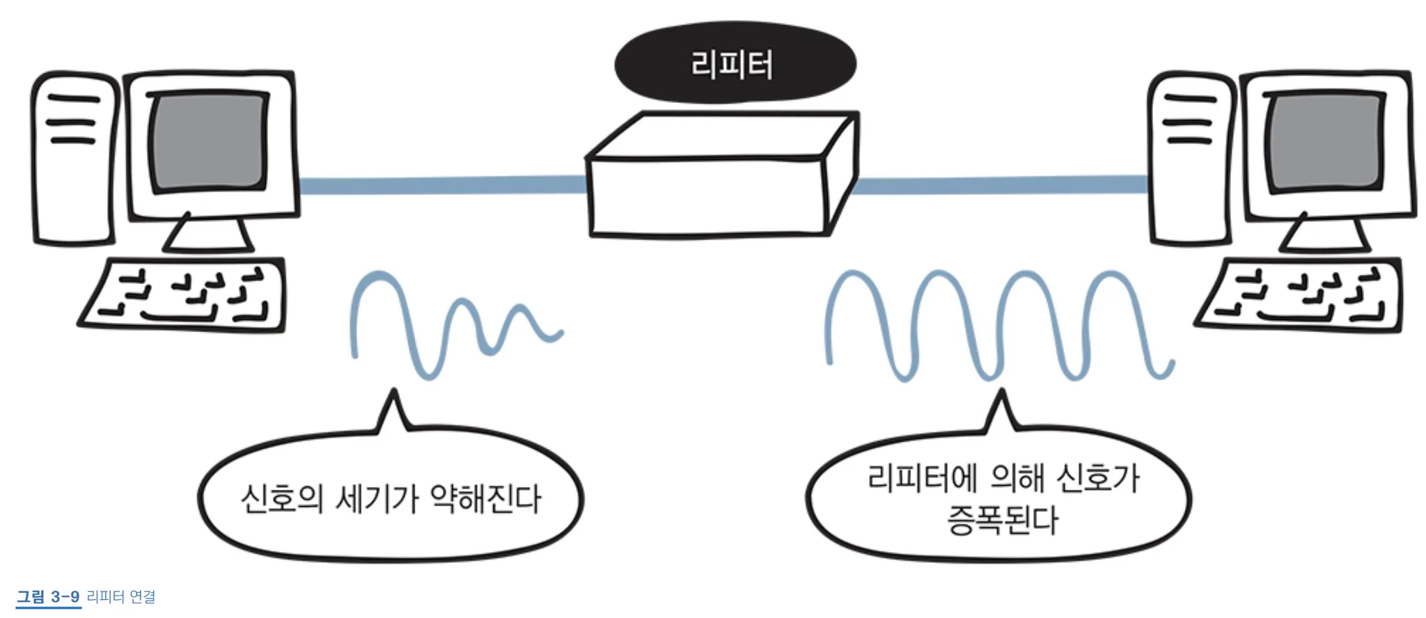 다음 그림과 같이 전기 신호를 정형하고, 증폭하는 기능을 가진 네트워크 중계 장비이다.