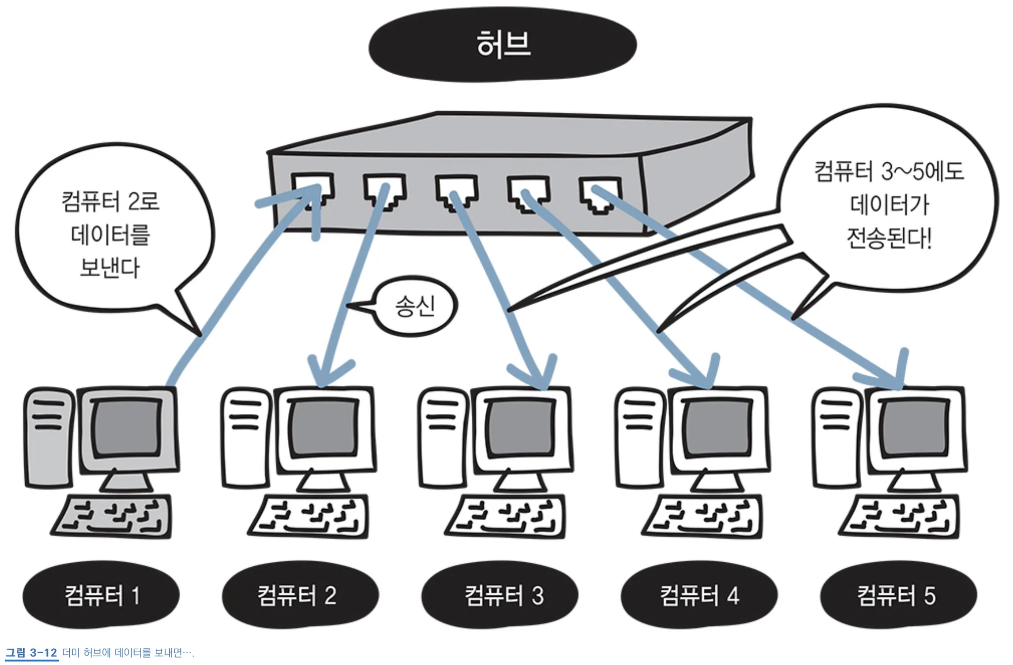 이처럼, 허브는 스스로 판단하지 않고, 전기 신호를 모든 포트로 보내서 더미 허브 라는 이름으로 불리기도 한다. 이런 단점을 보완하기 위해 나온 것이 스위치 라는 네트워크 장비이다.