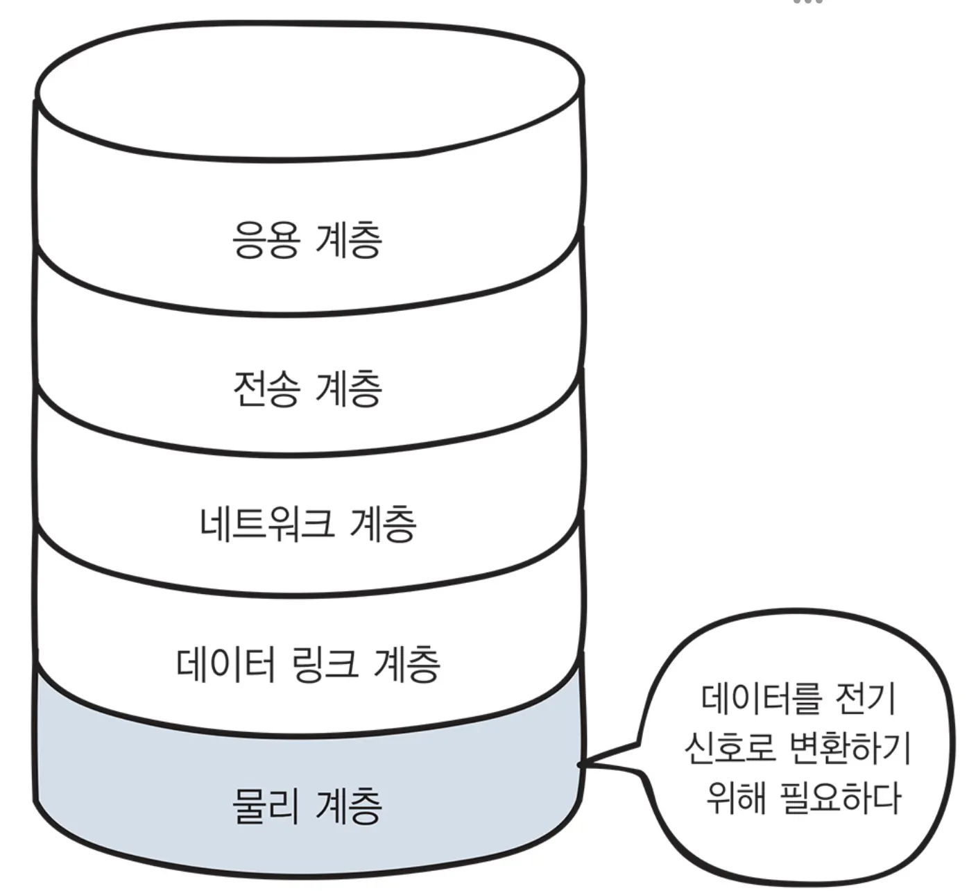0과 1만으로 이루어진 비트열을 전기 신호로 변환하려면 다음 그림과 같이 맨 아래 계층인 물리 계층의 기술이 필요하다.