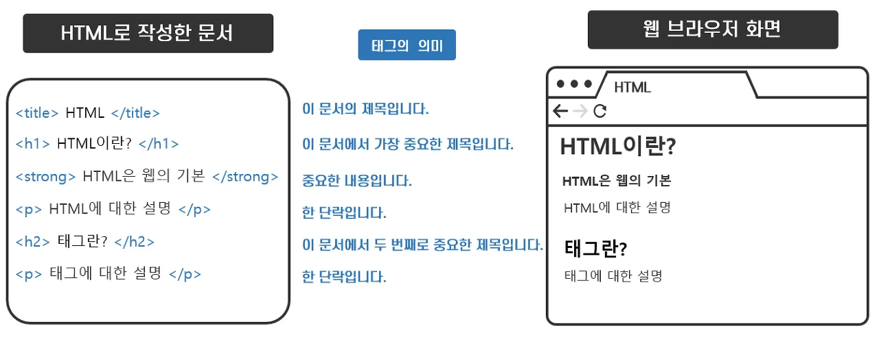 웹 브라우저는 HTML로 작성한 문서를 해석하여 사용자가 읽기 쉬운 형태의 웹 페이지를 보여주는 기능 수행.