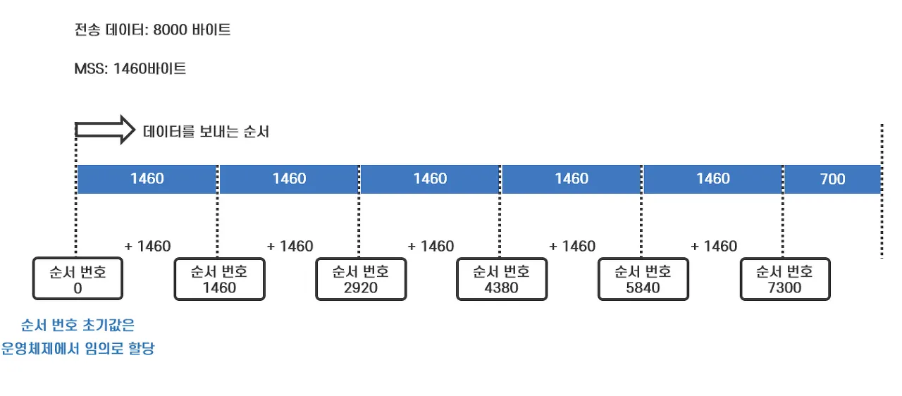 3-way 핸드 셰이크에 의한 연결 확립 과정에서 MSS결정. MSS 크기에 맞춰 데이터를 분할하여 패킷을 만듬. 순서 번호의 초깃값도 연결 확립이 이루어질 때 32비트로 구성된 임의의 숫자로결정됨.