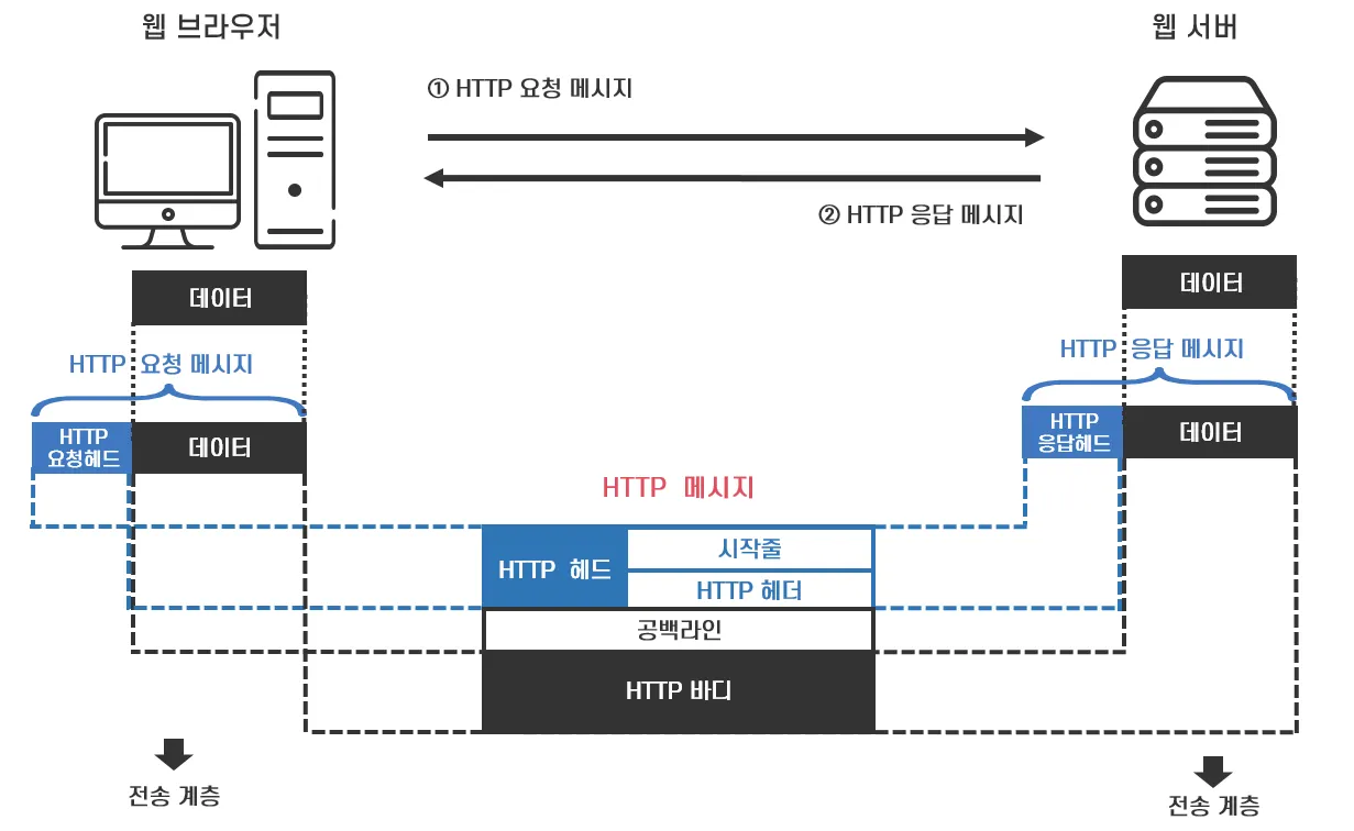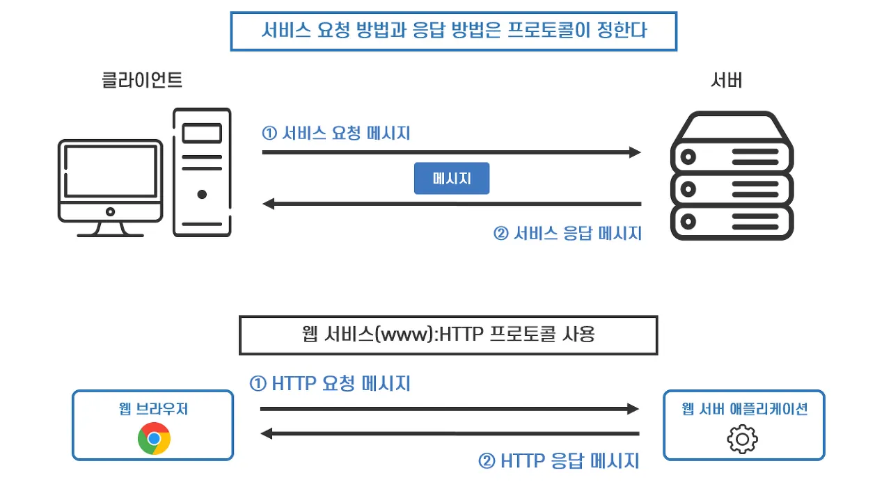 서버와 클라이언트가 메시지라는 데이터 단위를 사용하여 요청과 응답을 주고받으면서 서비스 구현.