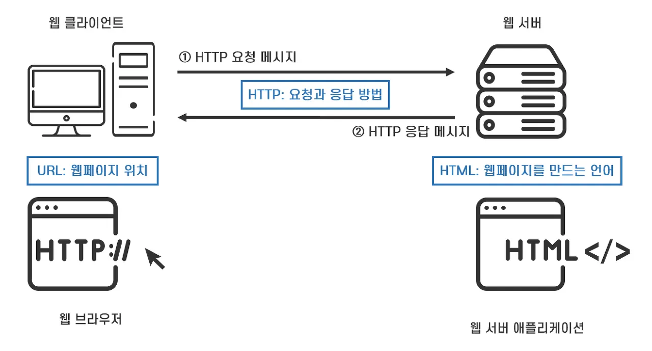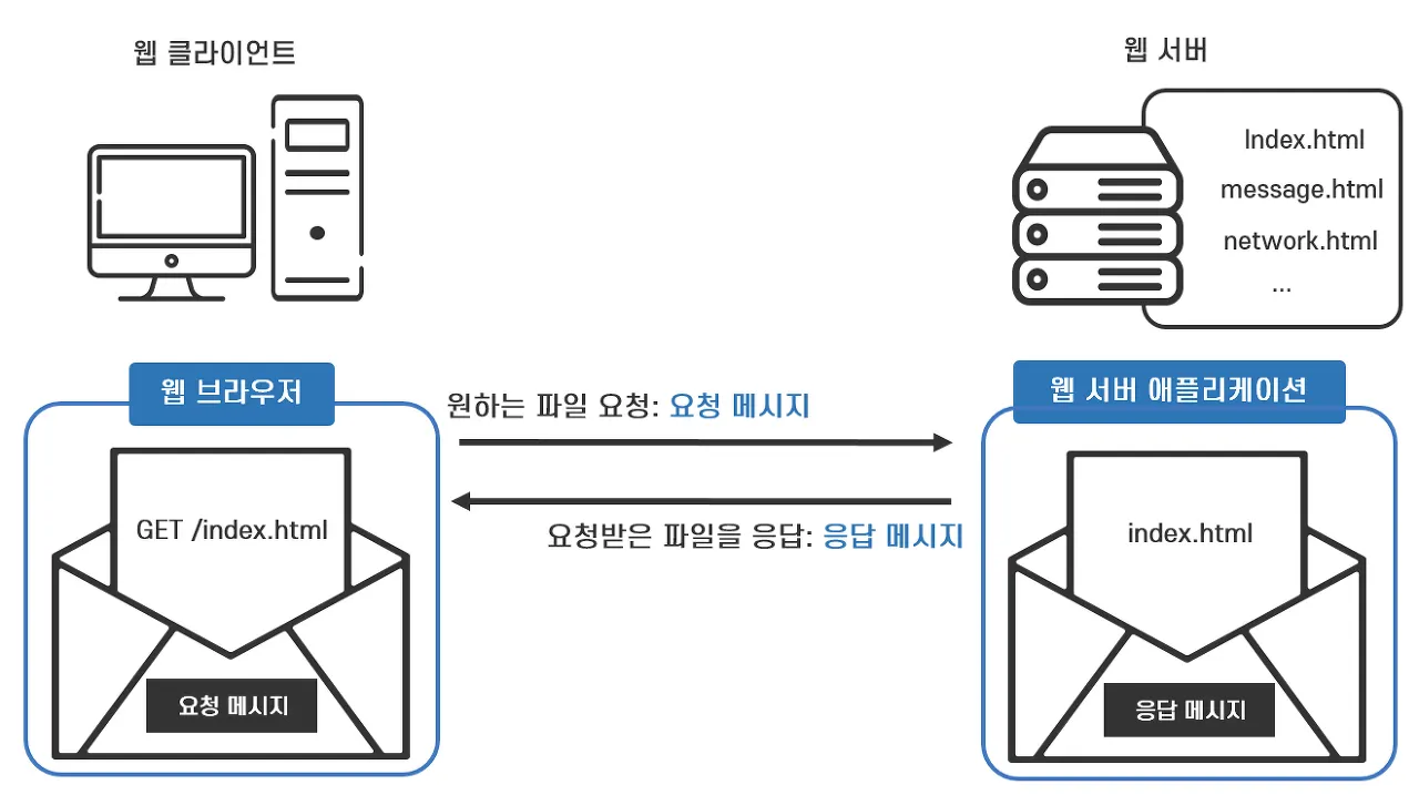 웹 클라이언트 애플리케이션(웹 브라우저)이 요청 메시지를 보내고, 웹 서버 애플리케이션은 응답 메시지를 보내는 단순한 방법으로 통신.