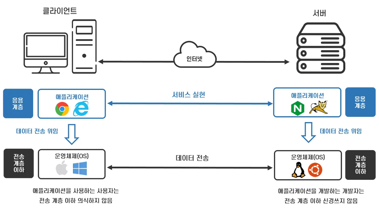 응용 계층의 역할은 서비스를 제공하는 서버 애플리케이션과 서비스를 요청하고 이용하는 클라이언트 애플리케이션이 구현.
