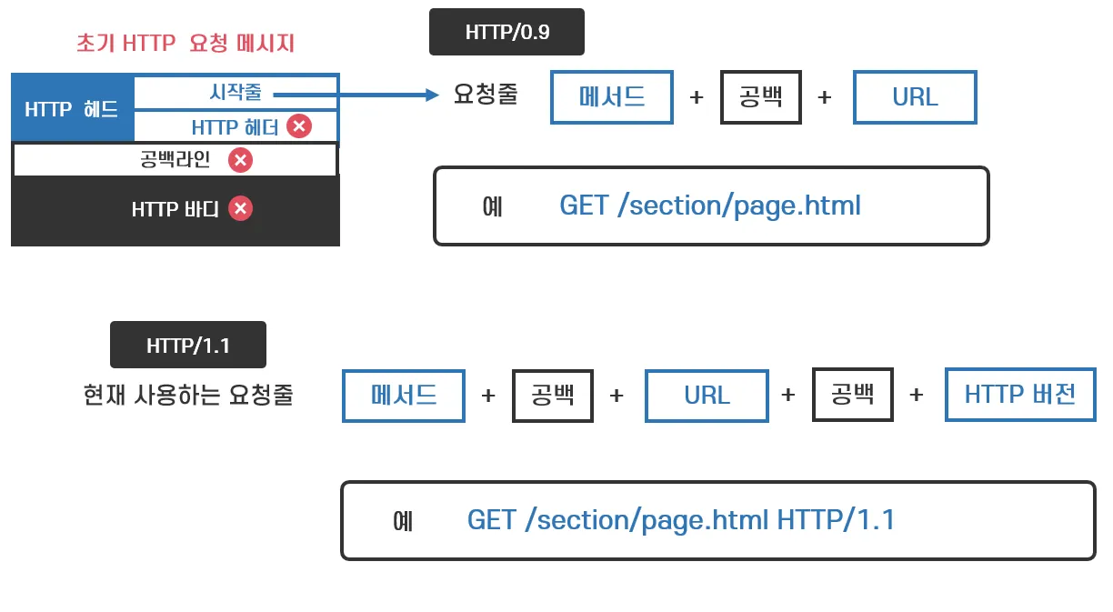 예전에는 메서드와 URL로만 구성되었었지만 현재는 클라이언트가 사용하는 HTTP 버전 정보를 추가한 요청줄 사용.