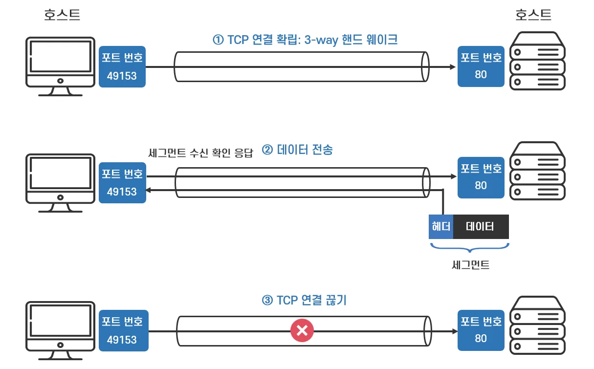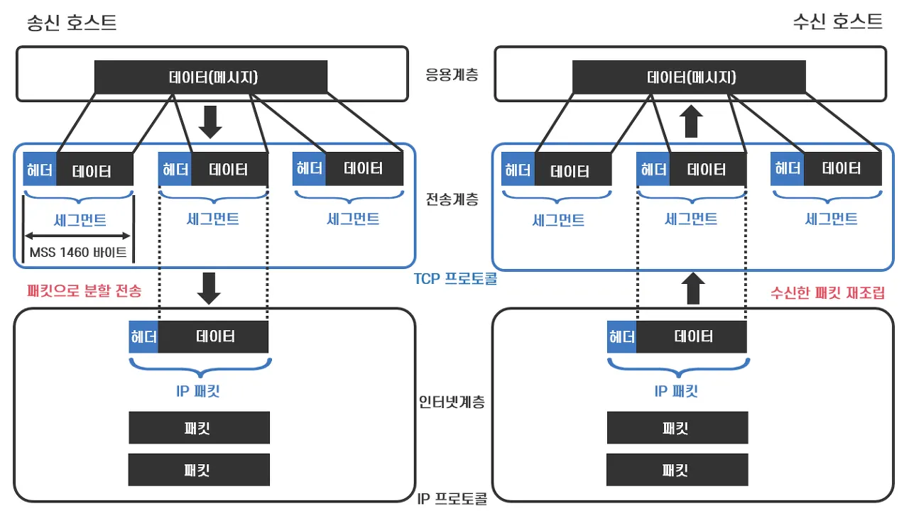 전송 계층의 TCP는 모든 패킷이 수신지에 제대로 도착했는지 확인하고 수신한 데이터의 순서를 송신한 순서대로 재설정하여 패킷들을 재조립함으로써 전체 데이터가 올바르게 전송되도록 함.(데이터 전송의 정확성, 신뢰성 확보)