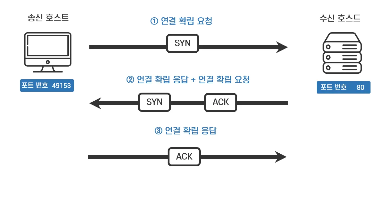 먼저 송신 호스트는 수신 호스트에 연결 확립 허가를 받기 위한 요청을 보냄.(데이터 없이 TCP 헤더만으로 된 커넥션 확립 요청 패킷을 보냄. 연결 요청 코드 값인 SYN사용)