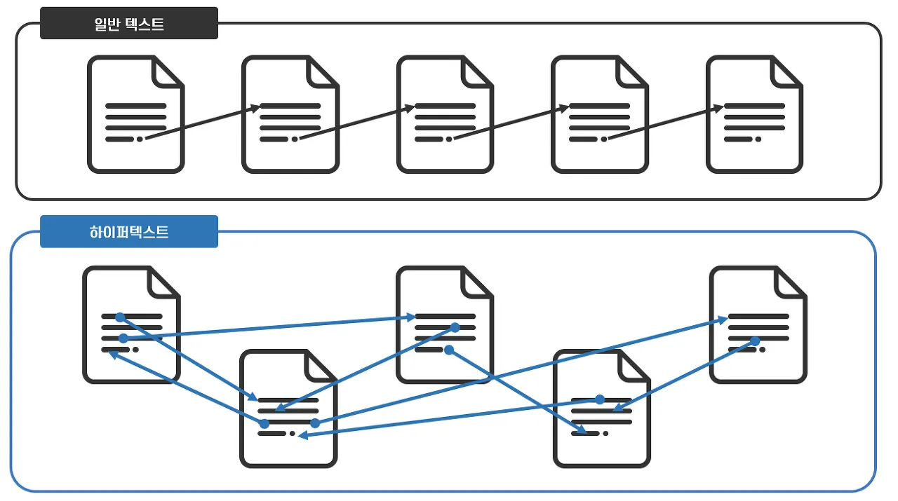 하이퍼텍스트 : 사용자가 생각하는 대로, 연상하는 순서에 따라 원하는 정보를 얻을 수 있게 하는 문서 체계