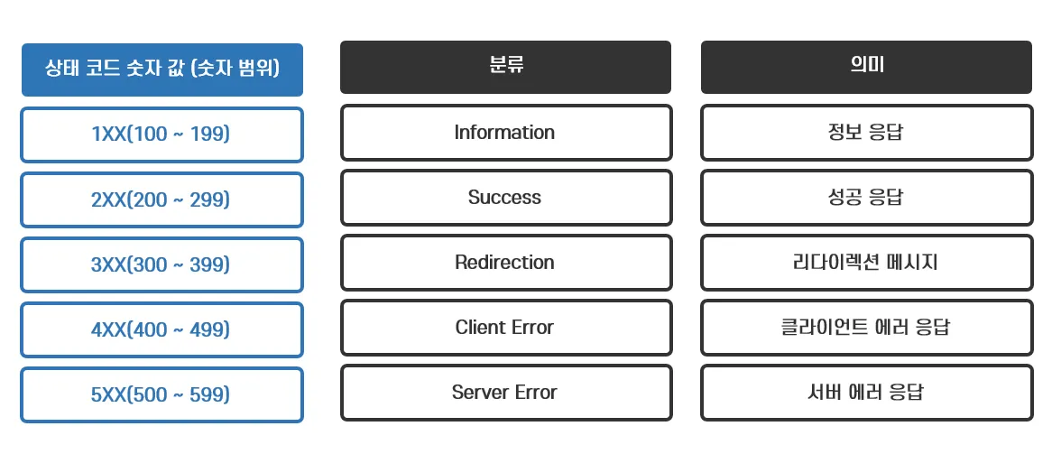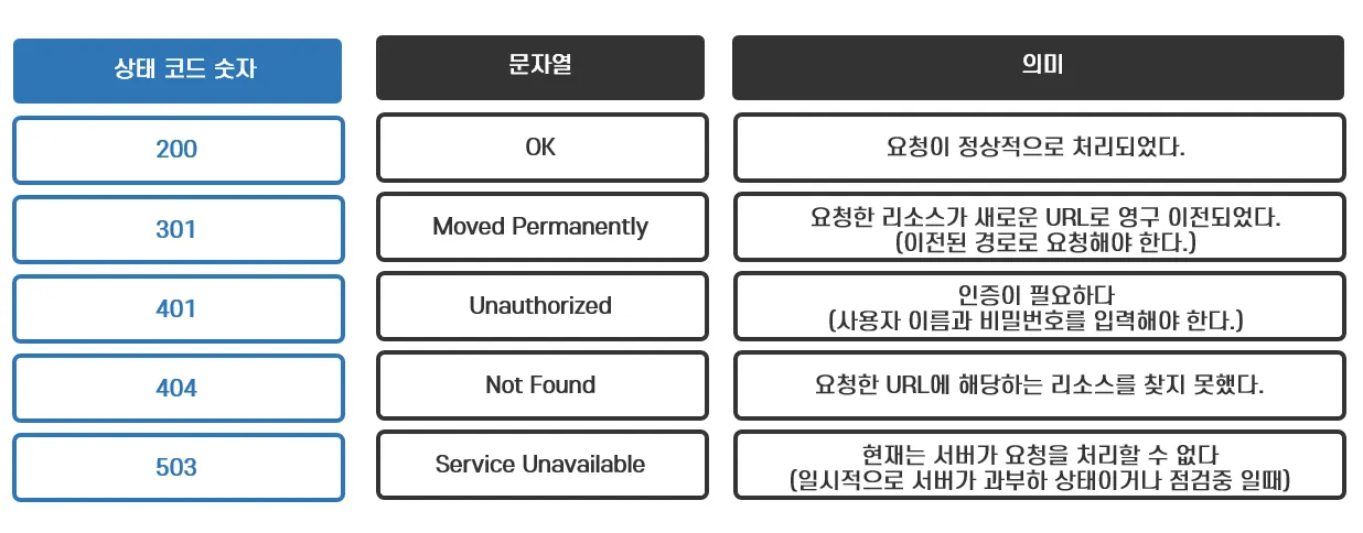 클라이언트가 보낸 HTTP 요청을 웹 서버가 정상적으로 처리했는지, 에러가 발생했는지 여부를 알려줌.(ex. 404 Not Found)