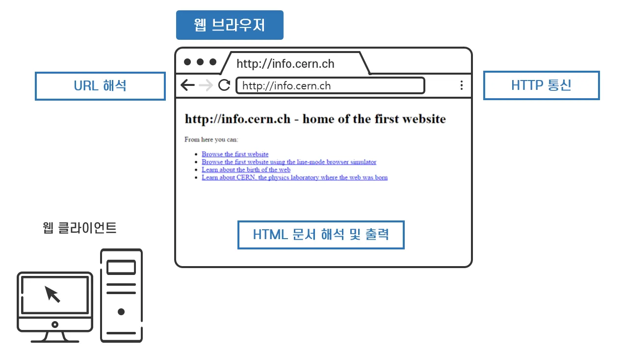 서버 클라이언트 구조 : HTML이란 언어로 만든 웹 페이지를 웹 서버에 저장하고, 다수의 웹 클라이언트가 웹 서버에게 웹 페이지를 보여 달라고 요청하는 시스템.