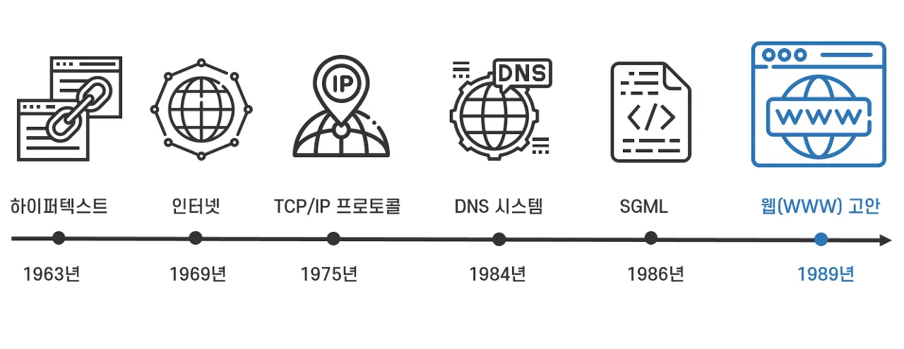 1969년 최초의 인터넷이 등장하고, 1975년 TCP/IP 프로토콜이 개발되었으며, 1984년 DNS 시스템이 만들어졌음.