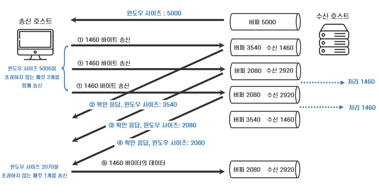 수신 호스트는 확인 응답을 보낼 때 TCP 헤더에 윈도우 사이즈를 지정하여 수시로 알려줌.