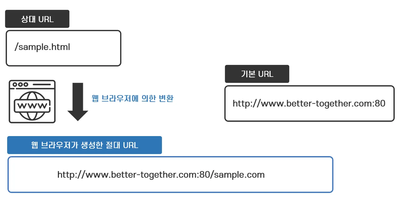 웹 브라우저가 기본 URL을 사용해 상대 URL을 절대 URL로 변환하는 기능을 갖고 있음.