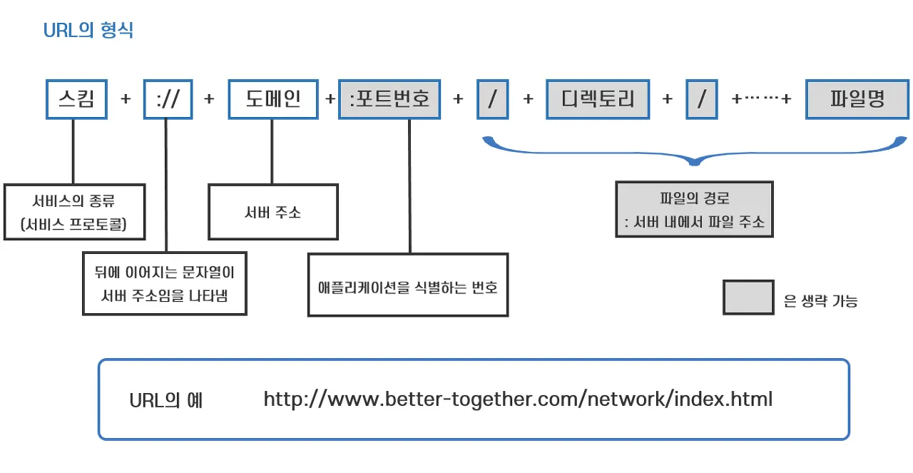 스킴 + 도메인 + 포트번호 + 파일경로로 구성