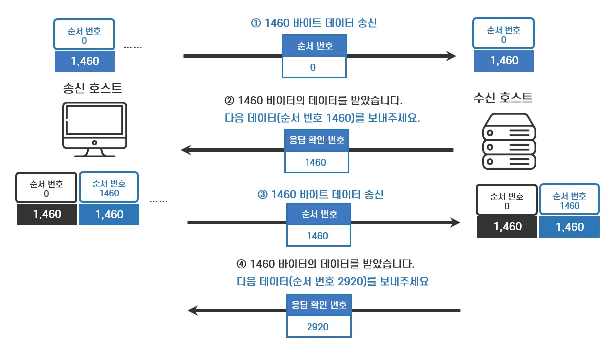 확인 응답은 수신 호스트가 몇 번째 데이터를 수신했는지, 다음에 전송할 데이터는 몇 번째 데이터인지 알려주는 확인 응답 번호로 이루어짐.