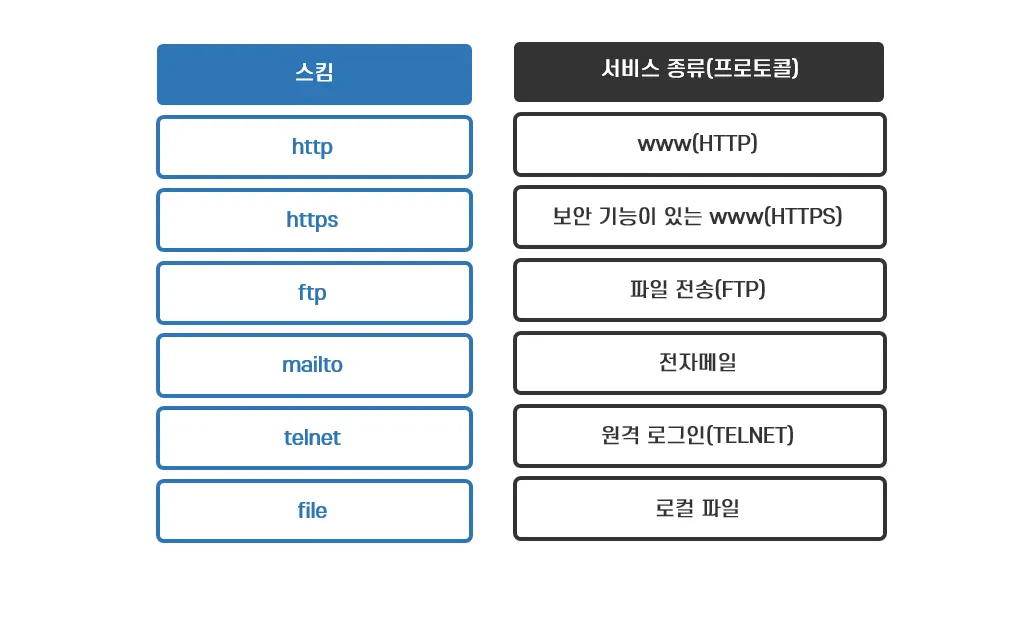 스킴은 주로 응용 계층의 프로토콜로 표시(http, ftp, file…)