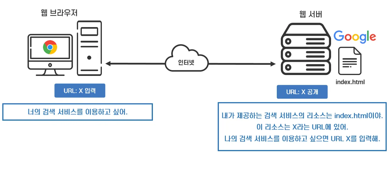 서버는 특정 서비스를 제공하기 위한 리소스를 저장하고, 이 리소스가 저장된 위치인 URL을 공개하여 클라이언트가 URL을 통해 원하는 서비스를 요청할 수 있도록 함.