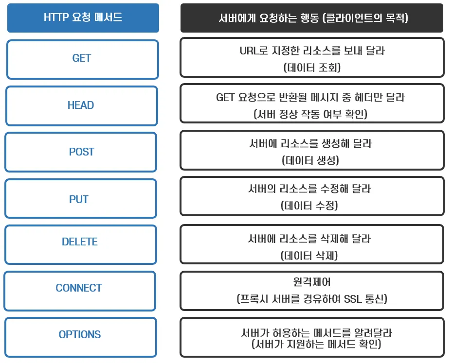 HTTP 메서드 : 웹브라우저가 웹서버에게 어떻게 해달라는 요청.(HTTP 동사라고도 함.)