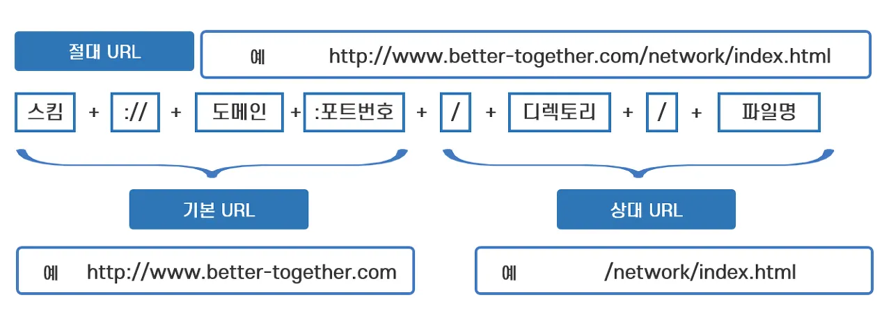 클라이언트가 처음 웹 서버에 접속할 때는 절대 URL을 사용해야겠지만, 웹 서버에 접속한 이후 웹 서버의 리소스를 사용할 때에는 상대 URL을 사용해서 웹 사이트를 만드는 것이 효율적.