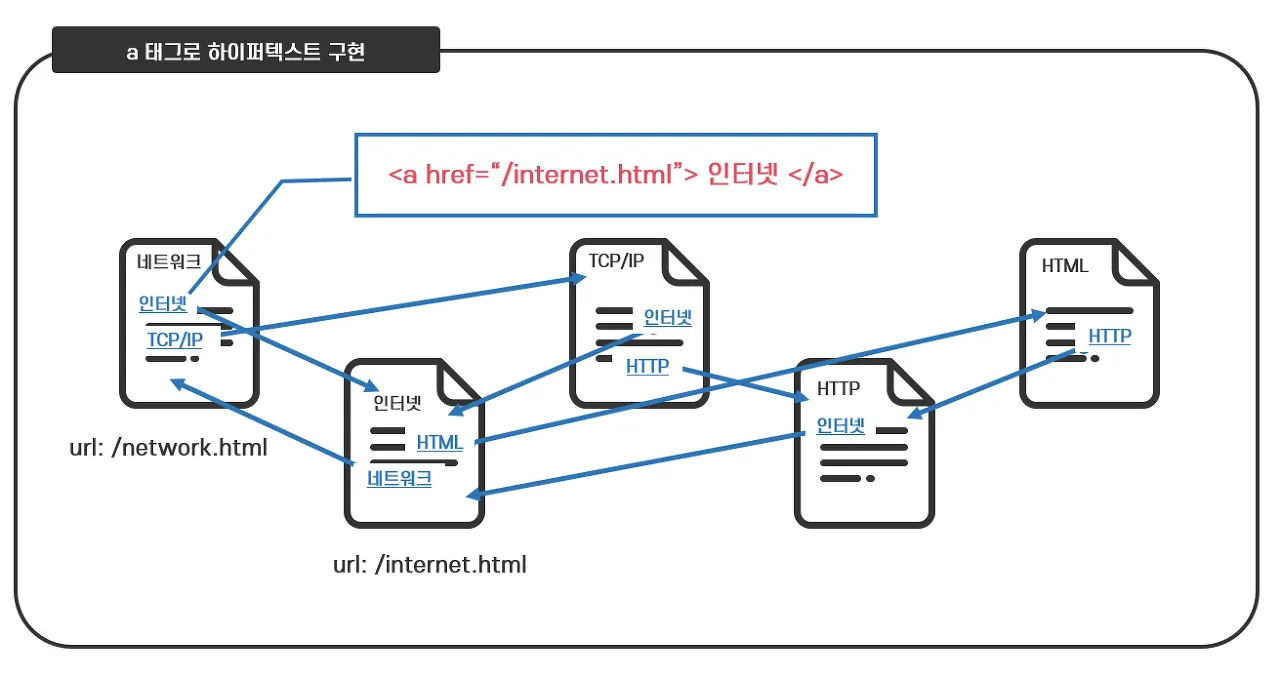 특정한 정보를 담은 HTML 문서를 만들어 웹 서버에 저장, HTML 문서가 저장된 위치를 URL로 지정, 이 문서와 관련 있는 다른 HTML 문서의 문자열에 URL을 삽입한 a 태그로 마크업함으로써 특정 정보가 다른 정보와 연결되는 하이퍼텍스트가 구현됨.