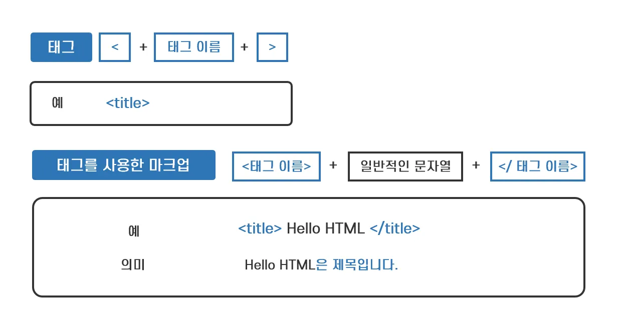 일반적인 문자열을 시작 태그(<태그이름>)와 종료 태그(</태그 이름>)로 감쌈.