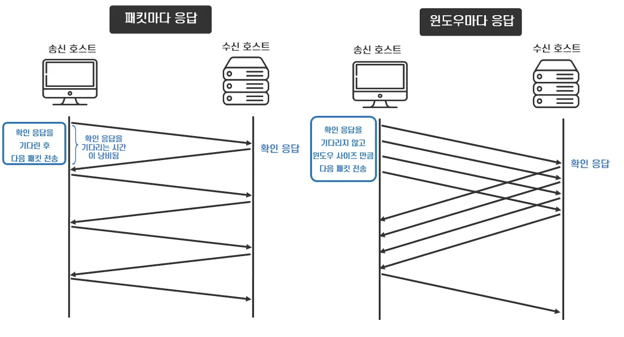 하나의 패킷을 보내고 응답을 기다리는 대신 여러 패킷을 한꺼번에 연속해서 전송한 후 확인 응답을 받음.