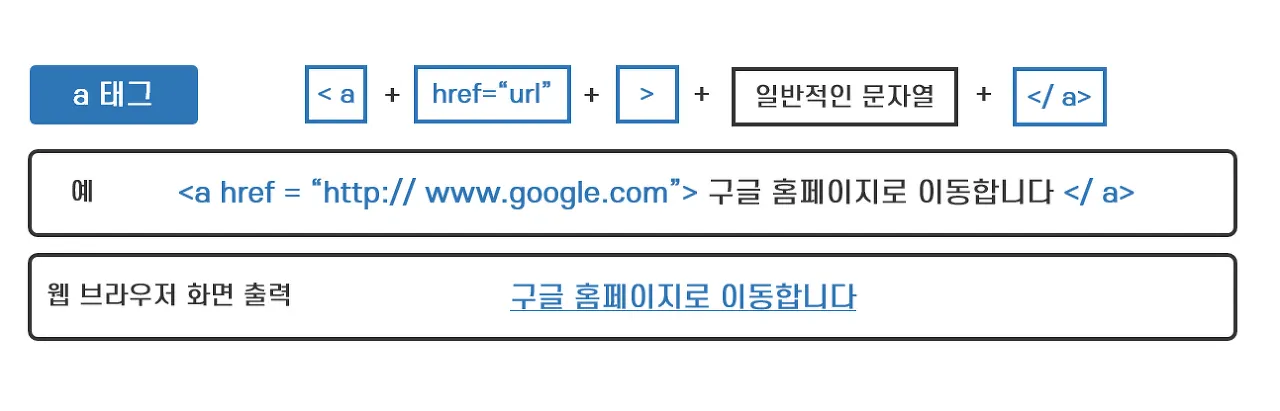 하나의 웹 페이지에서 다른 웹페이지로 연결되는 부분을 하이퍼링크라고 하며, 하이퍼링크를 구현한 것이 HTML의 a태그