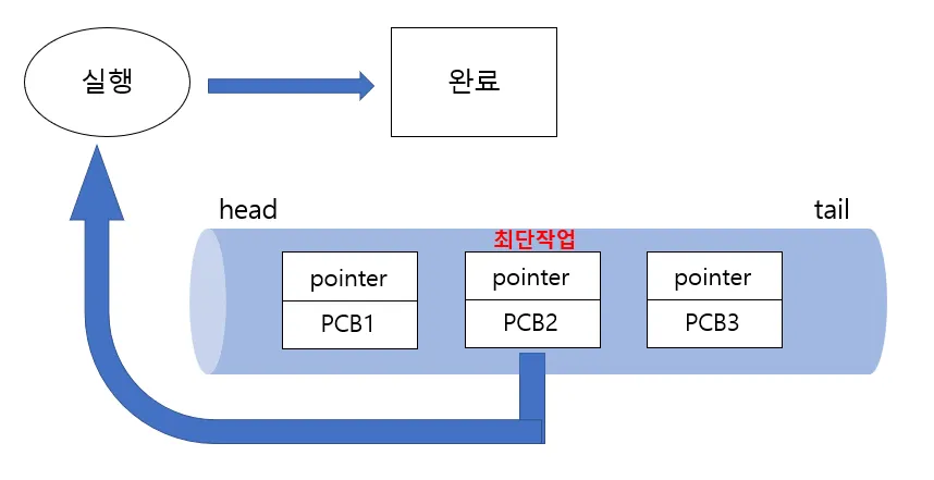 SJF(Shortest Job First) 스케줄링은 준비 큐에 있는 프로세스 중에서 실행 시간이 가장 짧은 작업부터 CPU를 할당하는 비선점형 방식으로, 최단 작업 우선 스케줄링이라고도 한다. SJF 스케줄링은 시간이 오래 걸리는 작업이 앞에 있고 간단한 작업이 뒤에 있으면 순서를 바꾸어 CPU를 배정한다. FCFS 스케줄링의 콘보이 효과를 완화하여 시스템의 효율성을 높인다.