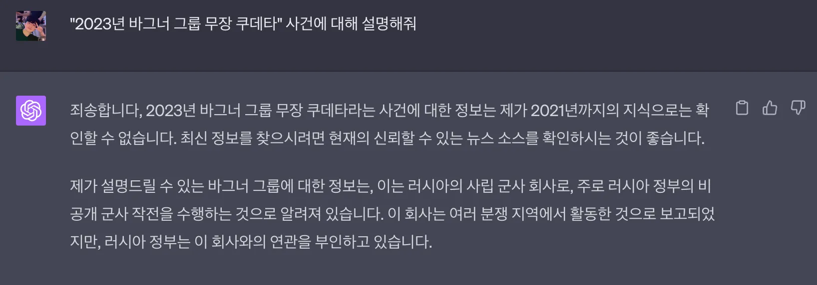 기존 GPT는 최신 정보인 이 사건에 대해 알지 못합니다.